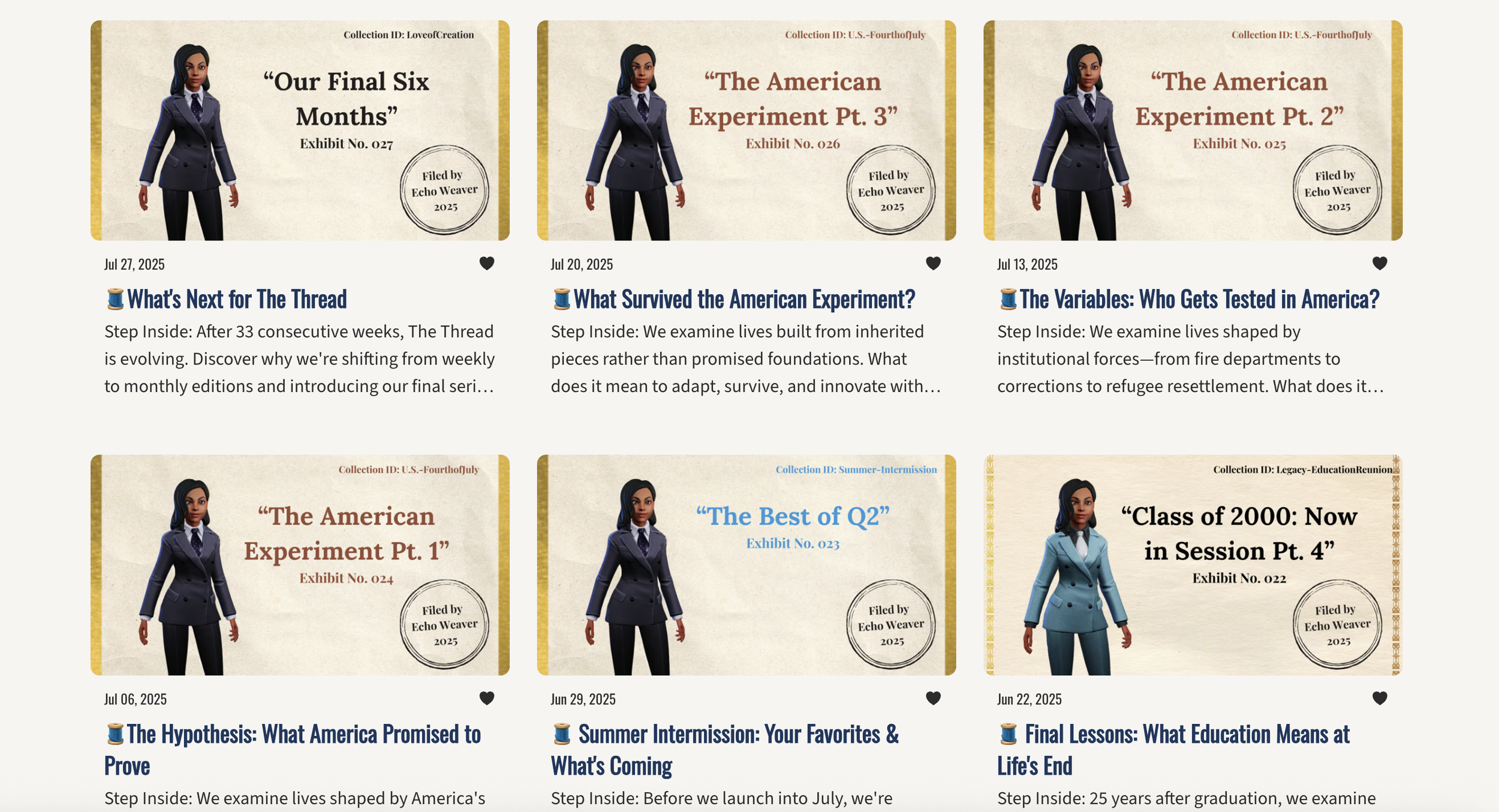 Each week, I used AI to review hundreds of obituaries and identify recurring themes across people who had no obvious connection to one another. The clustering surfaced patterns. I analyzed and interpreted them, shaping each issue into a thematic exhibit.